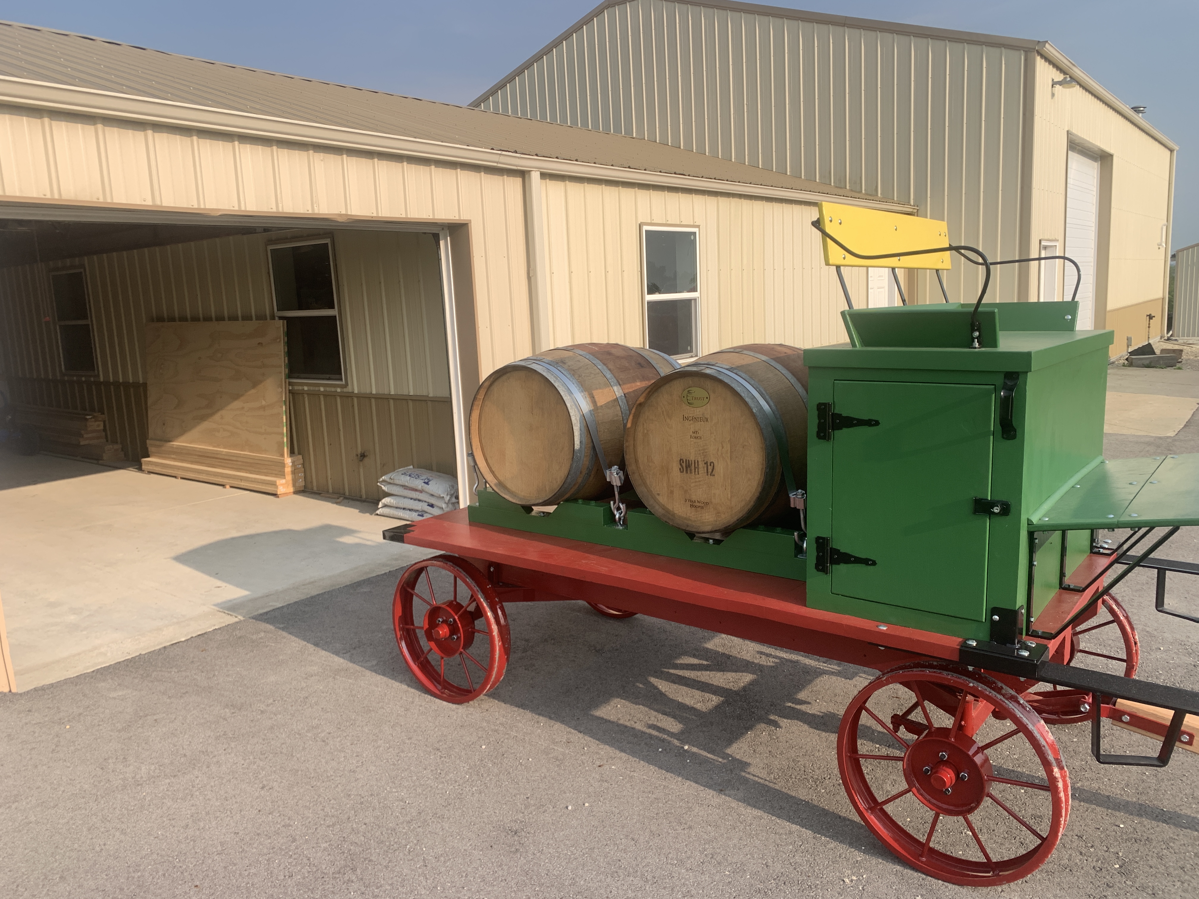 - Box is being placed on a Weaver Wagons 3800 running gear with 24” steel wheels painted red.